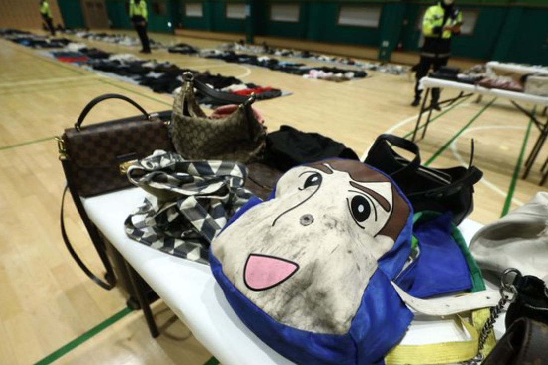 失物招领处设在一家体育馆内,场馆地面和桌子上摆满了个人物品,包括124个包、258件衣服、256双鞋子和156个电子产品等。很多衣服和鞋子上满是污渍,甚至沾有明显的血迹。还有皮鞋的鞋跟脱落,有眼镜镜腿被折断、镜片被踩碎。
