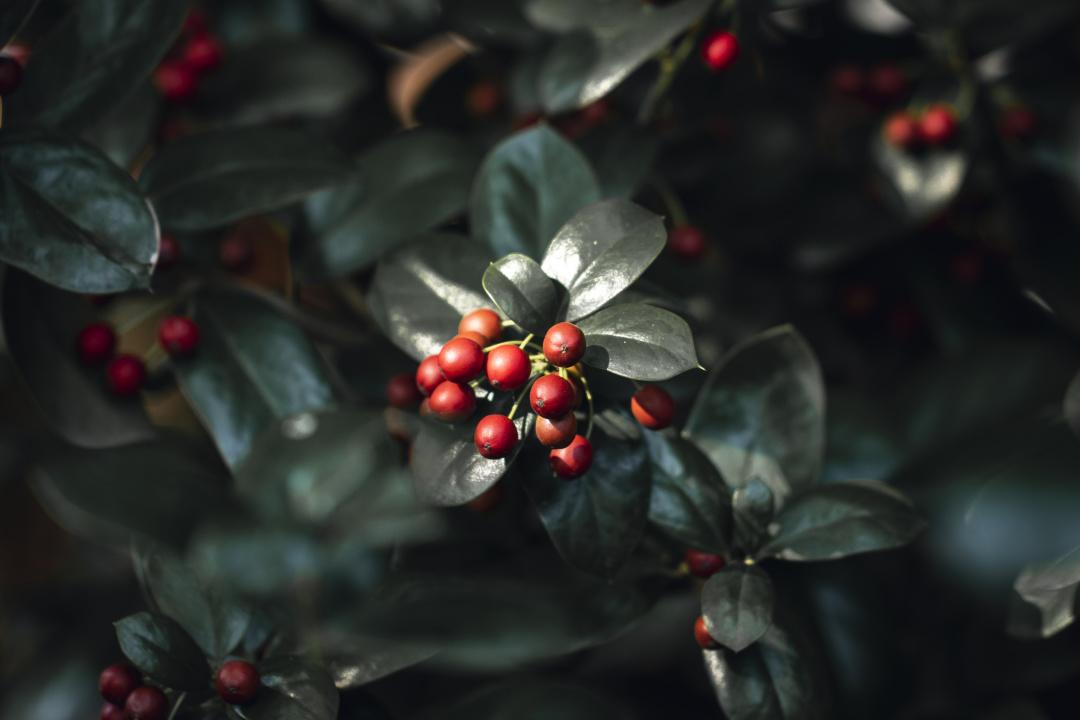 果实观赏要有优美的姿态或有艳丽的色彩。由于受室内环境因素的限制,室内种植观果植物的种类较少,常见的有南天竹金橘、石權、枸骨等。成熟后的色彩大多以红色为主,也有黄色,有的在成熟过程中还有各种色彩的变化。
