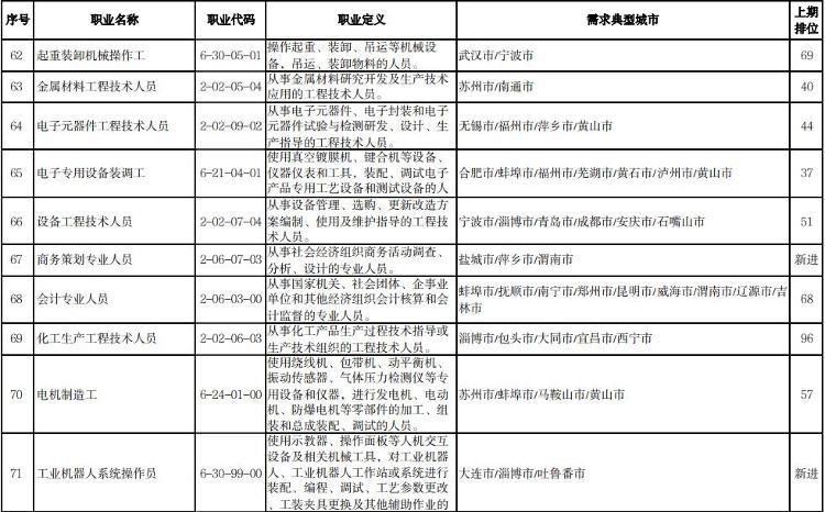 人社部介绍,本期数据构成据由“序号”“职业名称”“职业代码”“职业定义”“需求典型城市”“上期排位”六个部分组成。“职业名称”“职业代码”“职业定义”适用中华人民共和国职业分类大典的职业分类标准。“需求典型城市”是指填报该职业需求的典型城市名单,排在前面的城市需求缺口大于排在后面的城市。“上期排位”表示上期(2022年第三季度)该职业的排位情况。